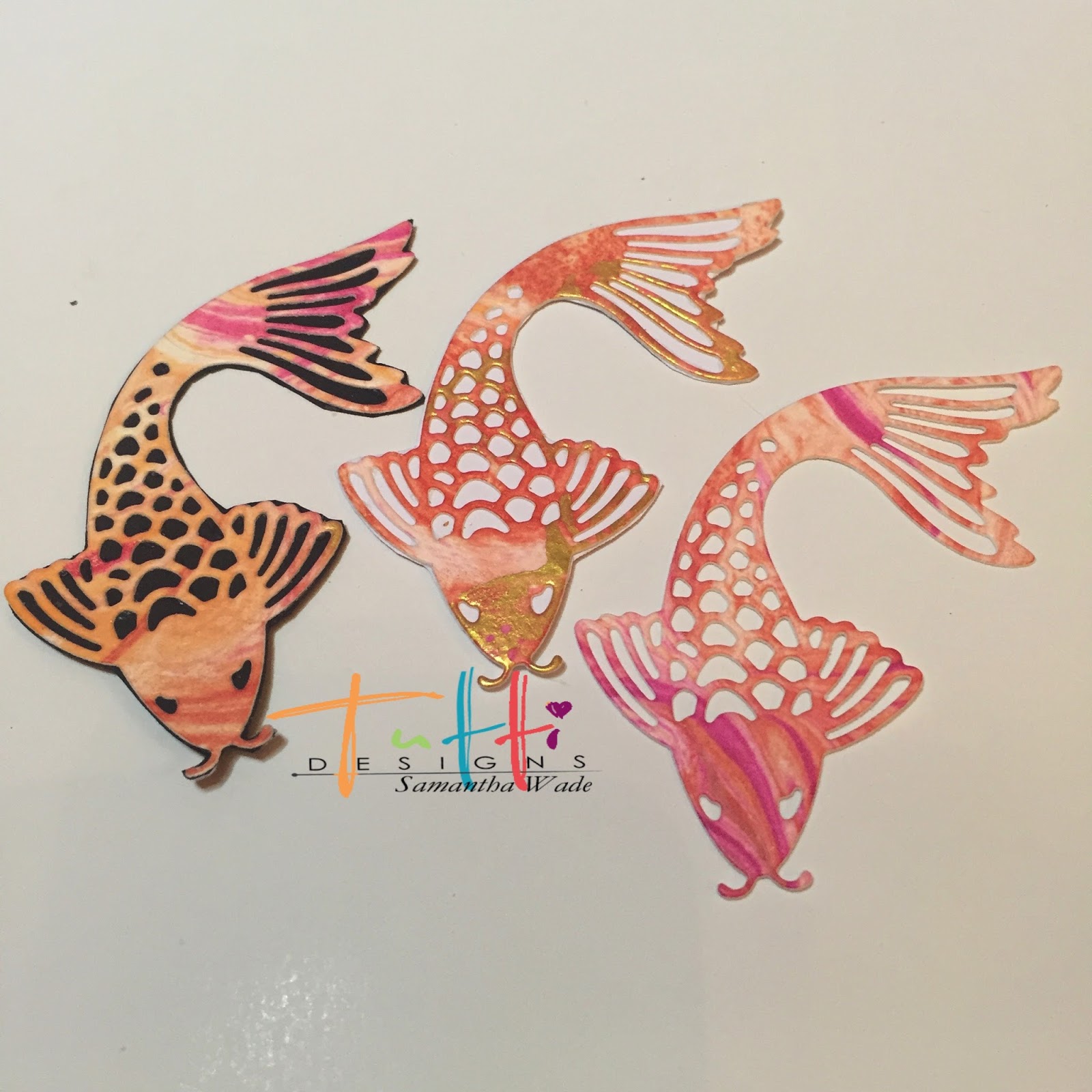 Die cut the Koi three times from patterned card. Then glue one onto black card, one onto white card and cut out. Shape each Koi with a ball tool and mat.